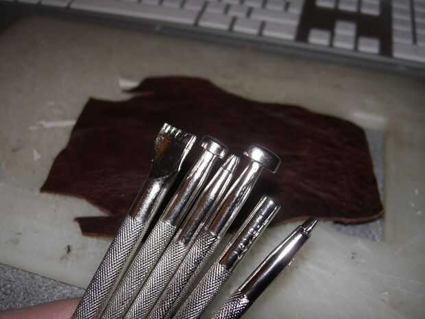 Había empapado el cuero con agua bajo un grifo, luego coloqué las diferentes herramientas de forma en el cuero y les dio un toque rápido con un martillo - si no tienes algunas herramientas de estampado, entonces puede utilizar un destornillador grande o la otra forma de metal.