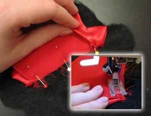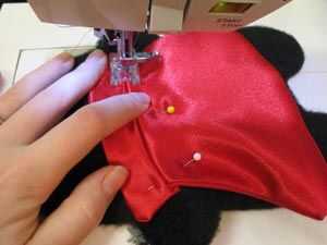 Es hora de darle el conejo su capa. Su pedazo de conejo detrás del gancho agarrador, y prende su cabo en el lugar. Si quieres, acabar primero los bordes con una costura, pero en general te oculta bajo el cabo. Coloque la pieza de cuello hacia arriba por su "cuello" (sé que no tiene uno, sólo supongo) y luego pin la pieza del cabo superior, el revés, con los bordes alineados, como se muestra