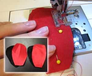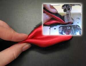 Utilice la plantilla para cortar dos piezas para cada oído, uno de tela furry y un satén para el interior de su oído. Prender juntos el piezas derecho contra derecho y coser una costura alrededor del borde, dejando la parte inferior abierta para convertirlos.