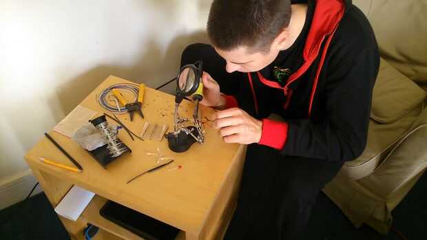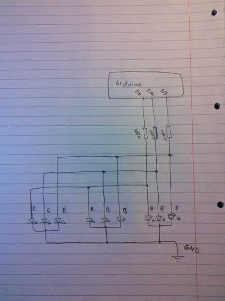 De soldadura. Cuando se cortaron todos los agujeros, preparamos los LEDs. Había unido todos los LEDs en paralelo y luego soldar una resistencia limitante actual de 100 ohmios en cada conexión positiva. Esto es una parte importante. No te olvides de poner las resistencias en, de lo contrario te drenar las baterías en 30 minutos o menos (es porque los LED es un poco como transistores y drene tanta corriente como pueden. Leer más sobre él en línea). También, para conectar los cables a mi Arduino fácil, yo soldar pernos de cabecera. Evitar que los cables se desconecte accidentalmente y hacer mucho más fáciles sacar el Arduino.