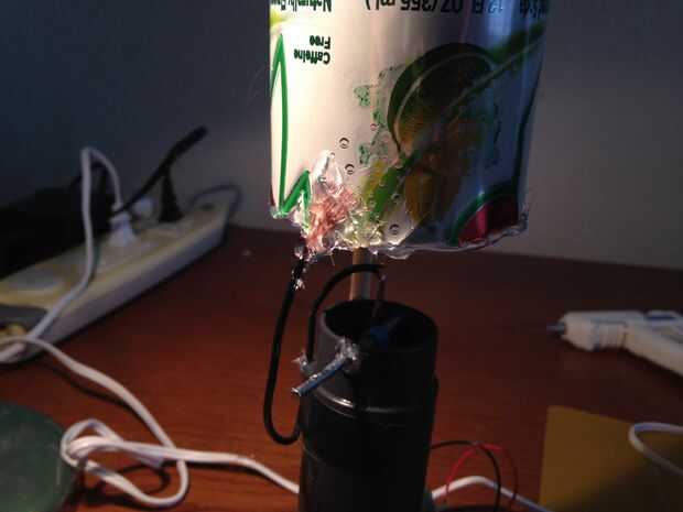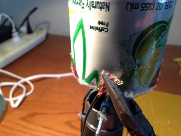 Conecte su carga superior recogiendo cable a la lata de soda. Fray el alambre hacia fuera y pellizcar estrechamente a la lata con los alicates de nariz de aguja, mientras esté caliente pegado a la lata.