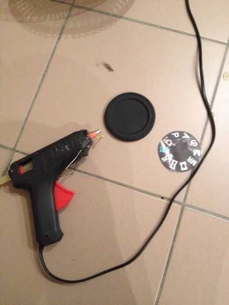 Tenía de Toen ik de knop uitgeknipt en gelamineerd (op de pas: lamineer de het apparaat palabra talón heet) en met hete lijm op een grote dop gelijmd die ik zwart tenía geverfd. Toen era de knop klaar en Möst hij alleen nog maar op de cámara worden gelijmd.
