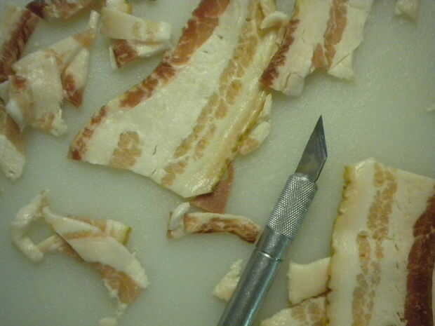 Eres casi terminado! Gire el encendedores rebanadas de tocino de pavo y colocar en primer plano extremo de la imagen, a la izquierda de centro. Houston, tenemos un árbol! Utilice el resto de los trocitos de tocino para rellenar en lugares y añadir detalles y textura interesante a la imagen. No olvides puertas y ventanas en el pueblo, vegetación en las colinas y chuletas y remolinos en el cielo. Si usted tiene mucho más energía que la que hago, incluso puede incorporar trozos de tocino, grasa de tocino y el tocino canadiense tristemente confundirse.