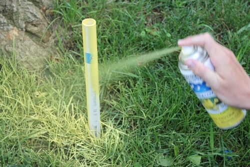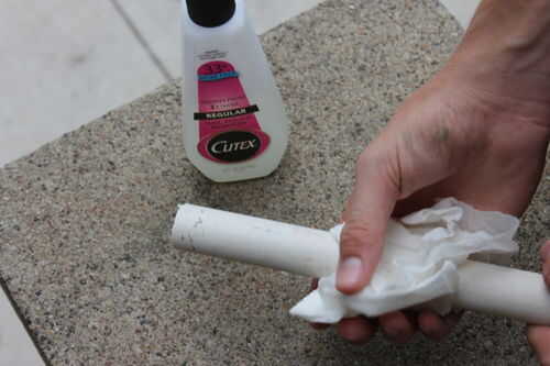 Limpie el tubo completo con acetona. "La acetona hace dos cosas: (1) se hincha la superficie haciéndola un poco más porosa y (2) dispersa las superficie ceras que son inherentes en la superficie de la extrusión cuando es fabricado. Por lo tanto, acetona también subirá el SE del PVC." (http://mgmindustries.com/mgm-blog/2011/06/17/how-to-paint-pvc-or-vinyl/)