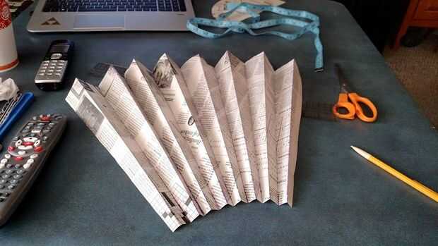 Coge un periódico y llegar a la redacción! Usted puede cortar piezas de falda media o trozos de falda de barrio como yo lo hice. He utilizado una regla super larga como un compás improvisado, pero no dude en utilizar lo que encuentres más fácil. Una vez que tengas tu cuarto o la mitad, dibujados los círculos (mejor hacerlo en una esquina por lo que es más fácil) recorto y doblan por la mitad continuamente hasta que tenga aproximadamente una pulgada de secciones. Desdoble el papel y marcar las líneas de doblez de arriba hacia abajo, es mejor usar una regla para esta parte.