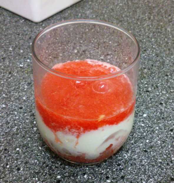 Vierta el jugo sobre la mezcla de frutas y scoop de helado.