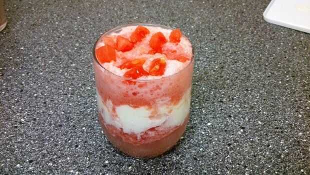 Para decorar el postre, ahora cortar el restante 1/5 de los frutos más en trozos pequeños y añadir encima la pelusa