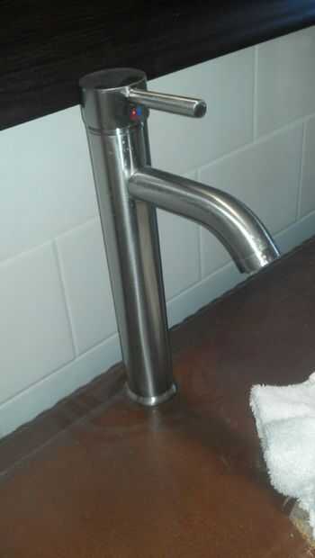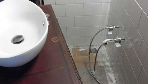 Usé sierras de menor diámetro para las tuberías flexibles de agua y un taladro normal para dos agujeros de montaje. Para fijar la pieza en su lugar, había una placa de metal con dos tornillos que ponen que básicamente un tornillo de Banco sobre la mesa para sostener la faceta todavía.