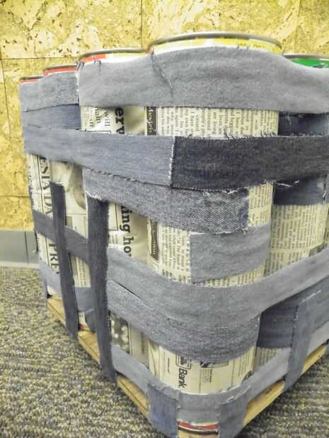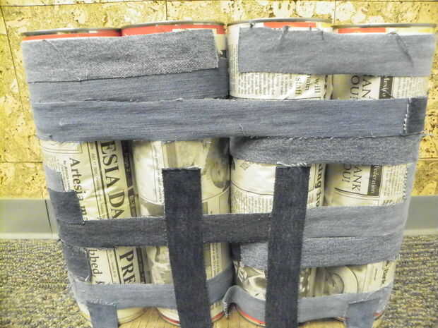 Cortar los jeans viejos en tiras de aproximadamente 1 "x 8" caliente pegue estas tiras en las latas de colocar una columna a otra. Cuando usted tiene 6 pares de columnas, pegarlos entre sí para que las heces son 4 latas a través de 3 latas de ancho. 12 latas en la capa inferior y 12 latas en la capa superior. 24 latas total.
