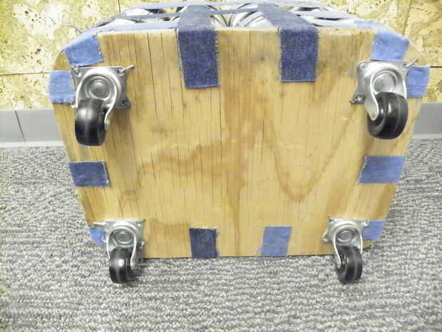 Este paso probablemente sería más fácil si coloca las ruedas a la madera antes de pegar la madera a las latas. Utilice tornillos cortos y un destornillador para fijar las ruedas a la madera cerca de las esquinas. Como se puede ver claramente, usé clavos en lugar de tornillos.