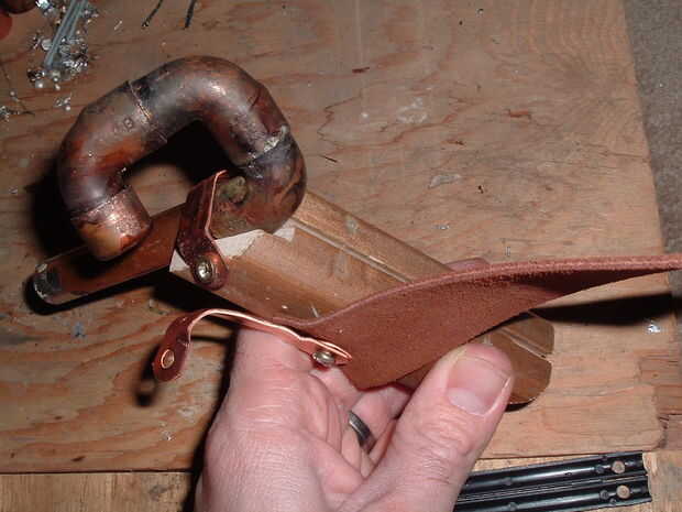 Un pedazo de cuero a la manija del tornillo y Envuélvala alrededor de la parte posterior al otro lado. Coloque la botella de butano en allí y fije el cuero nuevo con un tornillo. Esto debería mantener el tanque tanto como sea posible, pero también dejó deslizar un poco. El interruptor para abrir la válvula de combustible se cuelga bien de la correa de cuero. Para encender el gas solo empujas la botella de butano hacia abajo un poco hasta que se oiga el silbido; para desactivarlo se deslice el tanque hacia arriba.