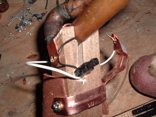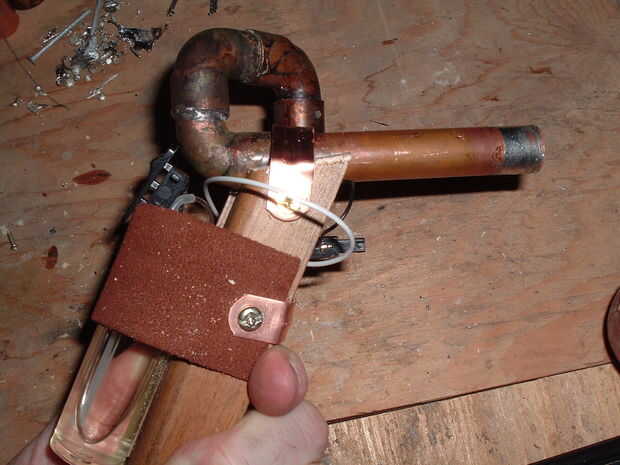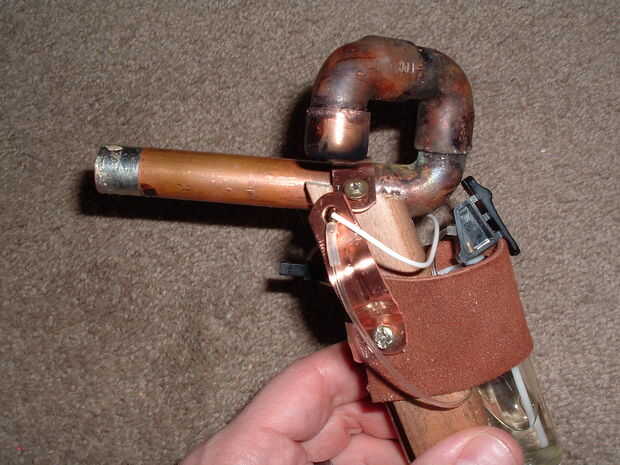 Doble un soporte del tubo y fíjelo al lado de la manija para que la llama se quema debajo de la tapa de cobre o la caldera.