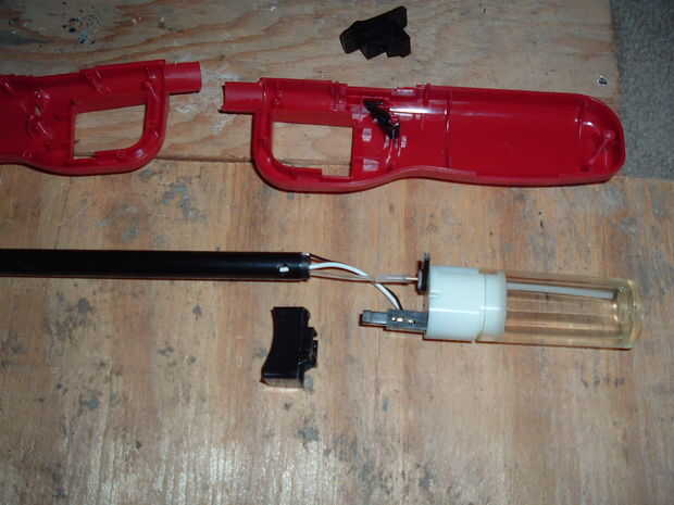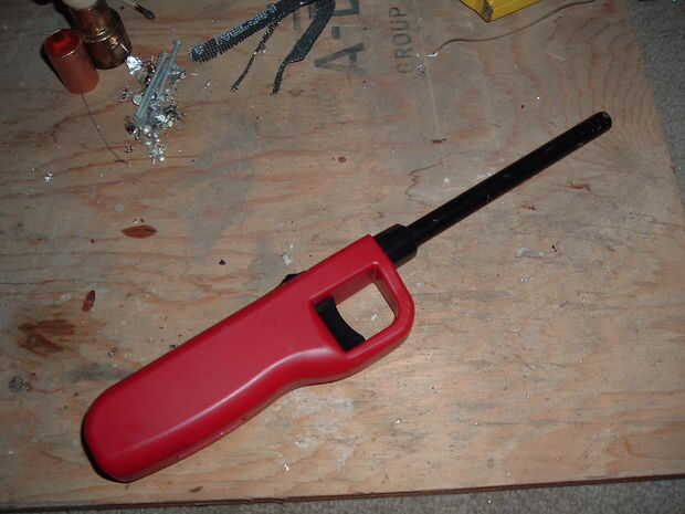 Inserte al clicker piezo en el mango para hacer un disparador; Esto es lo que hace la chispa para encender cosas. El cable negro de tierra para el cañón y el alambre blanco obtiene encamina hasta el punto de ignición bajo la caldera.