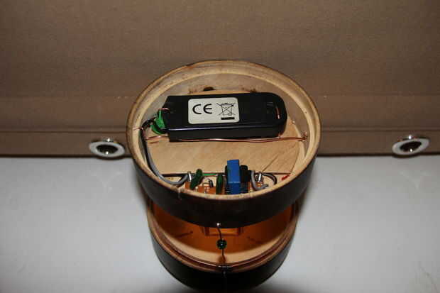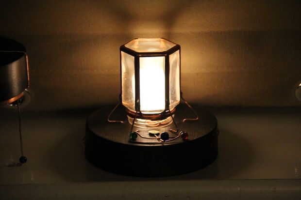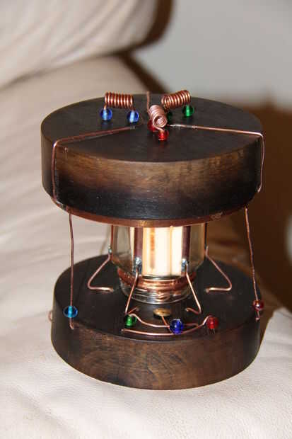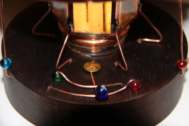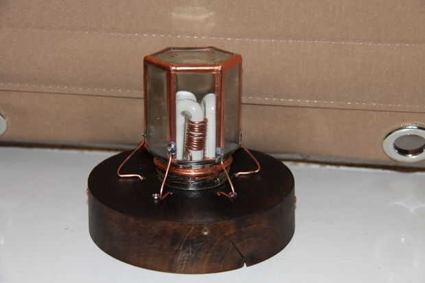 una vez que había probado el concepto se trataba sólo de encontrar algo que las partes individuales de la casa. la pantalla de vidrio es realmente un pequeño tarro que bordes con cinta de cobre de la hoja para hacer vitrales, la base y la tapa las partes superior e inferior de una caja de madera fina y los filamentos de cobre son la base sólida del cable de alimentación, suben a través de la base y los fija a la lámina en la jarra con soldadura para mantener todo en su lugar.