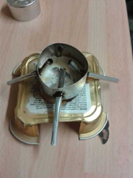 con una bolita de cera en su lugar perfora 4 agujeros uniformemente espaciados hasta la mitad del contenedor. La cera fue quitada (con el té luces estoy usando la hoja envase cera pellets y mecha son 3 unidades distintas y claramente no son hechas por vierte cera fundida en el contenedor de papel) los agujeros fueron agrandados con un bolígrafo, los tubos de aire insertados y el papel de aluminio de la carcasa moldeada detrás alrededor de ellos. Usé el escriba y el punto de la brocheta. No pude obtener el ajuste apretado sin pegamento. Limpié alrededor de los tubos con un bastoncillo de algodón humedecido con un combustible más ligero (blanco gasolina para encendedores zipo) y aplica una pequeña cantidad de pegamento de la resina del epoxy sistema rápido del pack 2 en cada articulación. En retrospectiva debo probablemente han dejado durante la noche completamente curar en lugar de simplemente dejarlo establecido antes de la prueba.