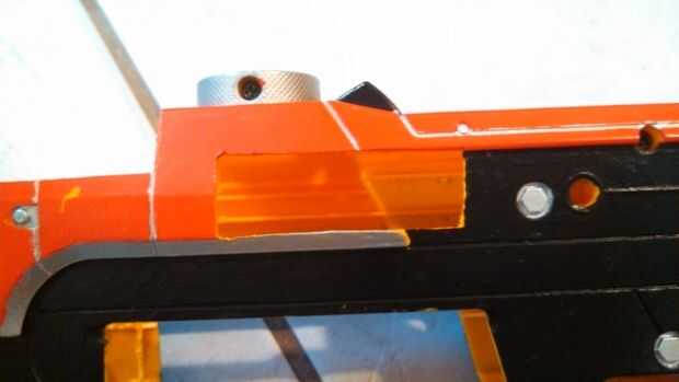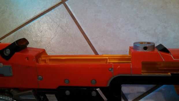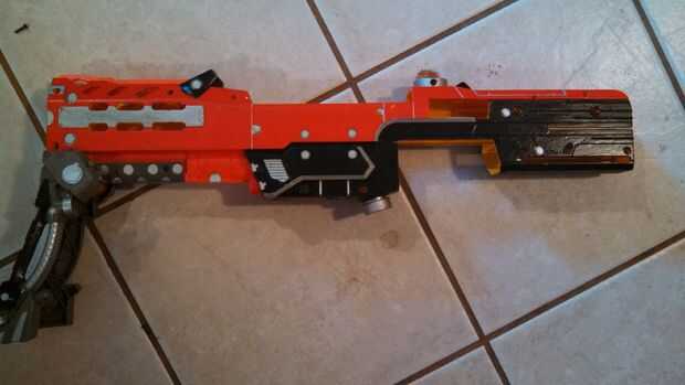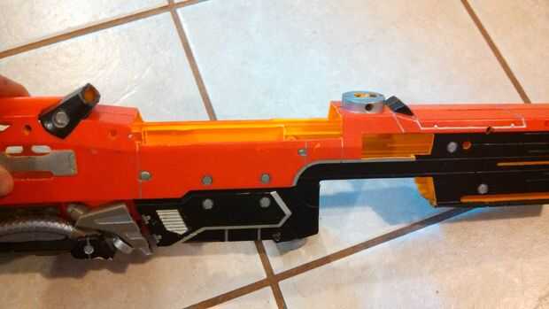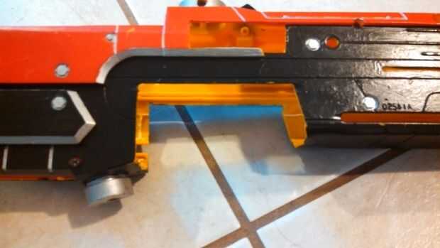 después de haber eliminado todo el plástico en el interior... juntar las 2 piezas de la pistola nerf detrás y poner en las screwes... a partir de ahí empezarás a corte con un rompecabezas de electrice o una sierra de mesa... A barbecho y comparar las fotos para mi arma ya cortada para el montaje perfecto!!!!