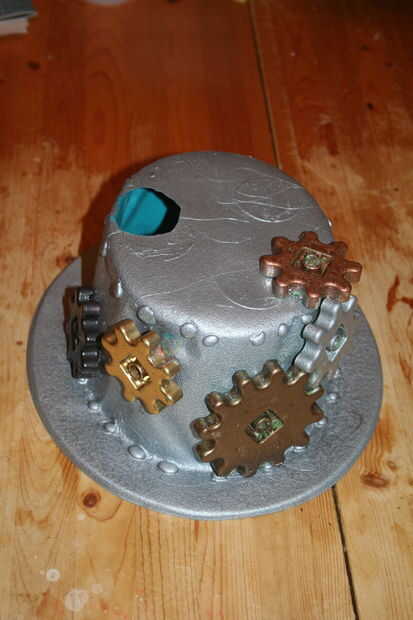 Esta foto le da una buena idea de las varias pinturas utilizadas en el proyecto.  El agujero en la parte superior permite el tallo de la calabaza empujar a través.  Parecía más fácil que asierra la dura madre vieja de la calabaza.  Se veía mejor también.  Los "remaches" alrededor de las áreas de"join" son sólo manchas de pegamento caliente colocado en el sombrero antes de pintar.  Este proceso produjo un montón de hilos de pegamento caliente, más de los cuales fueron fácilmente cepillado, pero recibí un elogio sobre la "decoración de curlie cue" en la parte superior, que fueron sólo firmemente pegados y pintados tan.  Los engranajes fueron pintados por separado y Unidos con pegamento caliente más.  Tenga cuidado cuando plásticos de la pintura a pistola, algunos disolver o deformar al pintado.  Esto puede minimizarse mediante pulverización desde una distancia para que la pintura está casi seca al contacto.  Use varias capas de luz para lograr buena cobertura.
