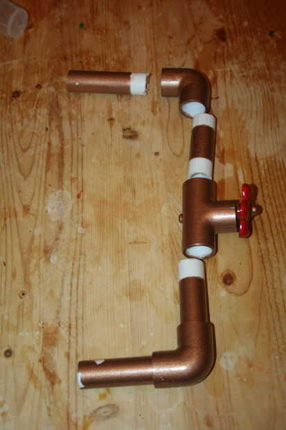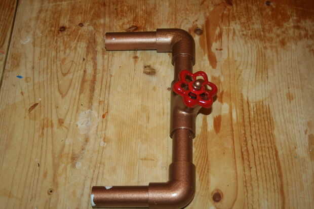 La válvula de cierre de emergencia fue pintada con la pintura de bronce martillada.  Todo el conjunto es de aproximadamente 9 pulgadas de largo y 4 pulgadas de ancho.  Probablemente no quiere pegar ya sería una pérdida de flexibilidad y pegamento.  Utilice cualquier Serrucho para cortar las secciones y prensa que encajen juntos.  Perfore un agujero de enfrente de la abertura de la conexión T y enrosque un perno largo fino de dos pulgadas a través de él.    Prueba de ajuste la manija de la llave del jardín y el perno con una tuerca de la tapa.  Una vez que estés satisfecho con la pieza, retire la manija de la llave y vuelva a colocar la tuerca de la bellota.  Un bucle de cadena a través de la pieza del hilo de rosca, colgará para arriba y pintura de aerosol Tenga cuidado de cubrir bien todas las áreas.  Cuando esté seco vuelva a colocar la manija de la llave use la pieza para marcar la calabaza, y usar el taladro para hacer los agujeros correspondientes en el lado de la calabaza para la instalación.