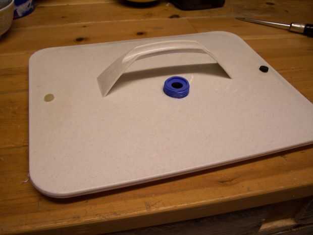 Uso cuidadoso de un taladro inalámbrico broca de 25mm produce un agujero aseado agradable, un pequeño truco aquí, al perforar a través de plástico siempre apoyarla por debajo con un bloque de madera ayuda a prevenir la flexión y posibles grietas o incluso romper.