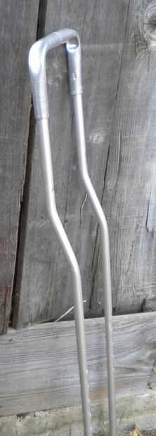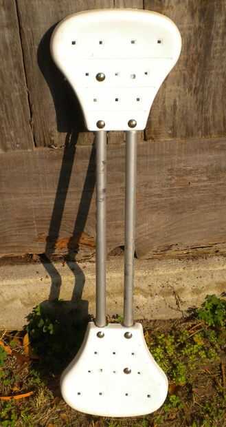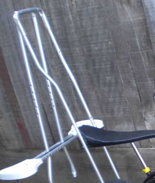 El sissy bar y planeador-swing es un par de muletas de aluminio, además de las esquinas de la silla de césped y asientos de plástico pequeño. Tenga en cuenta los agujeros de la muleta ajustable asas (3ª foto).