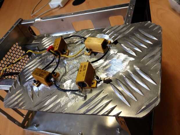 3 soldamos en serie los cables de las cuatro resistencias y añadimos al circuito la alimentación para la cual saludando un cable de 12V y una toma de tierra, las cojeremos de la fuente de alimentacion del PC de desguaze. La tabla de colores indica el voltaje de cada cable.