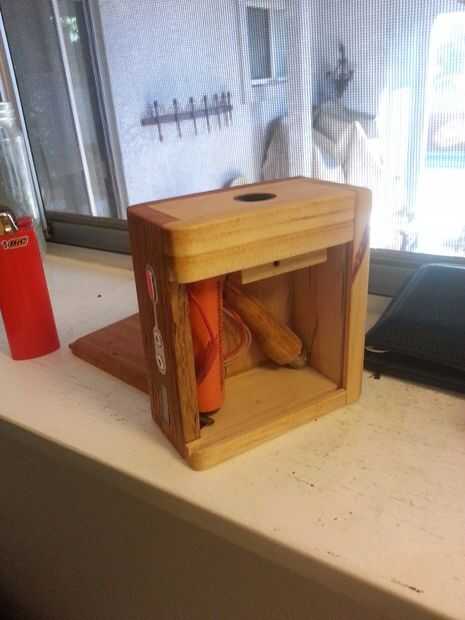 Realmente no hice nada especial dentro de la construcción de la caja. Tenía que ser un poco creativo con el material había que realmente trata el ancho de las piezas. La parte superior de la vape es el espesor original de la espalda y la parte inferior. Del mismo modo la puerta de la diapositiva y otro lado son mitades de una sola pieza. La cara es su propia pieza. La anchura del corte con una sierra de mesa. La pieza superior que alberga el recipiente tiene un agujero de 5/8" para el ojal de caucho que también actúa como un inserto de boquilla / aislador. El interior tiene un orificio de 3/4" para albergar el grueso de la taza de metal, las conductoras de la tira que envuelve alrededor del metal del tazón de fuente, algunas capas de kapton cinta para mantener bajo el sensor del termómetro de la unidad y el paño aislante con más cinta del kapton. La pieza que está al lado de la batería es la parte inferior en y ha perforado los agujeros para la circulación de aire. Usé un solo tornillo para mantener juntos que niega el uso de pegamento y permite el acceso para cualquier tipo de mantenimiento adicional. La batería tiene un orificio de 3/4" para guardarlo de la mudanza y añadir presión a la parte inferior que tiene un pedazo de espuma que protege el cable positivo y actuó como un espaciador en la carcasa del antiguo. La placa de circuito se encaja en un espacio distribuido de igual dimensión y la Fronda se enrutó para acomodar para los pequeños botones de ventana y el control. Originalmente son de la vieja vape y en vez de ir a través de hacer una nueva de otros desechos y tratando con piezas tan pequeñas sólo había pegado la cara plástico en y taladrar los agujeros para los botones.