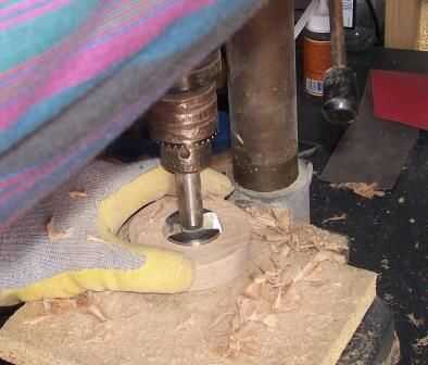Hago esto como una guía para el uso de un poco de Fostner. Usé un 1,5 pulgadas Fostner broca para taladrar un orificio medio camino a través del disco entonces dado vuelto le en y terminado el taladrado. Usted puede perforar todo el camino a través de la primera parte si te gusta. Su elección.