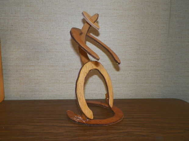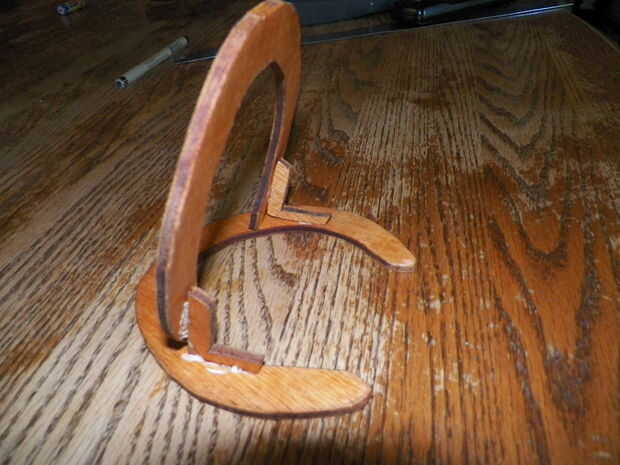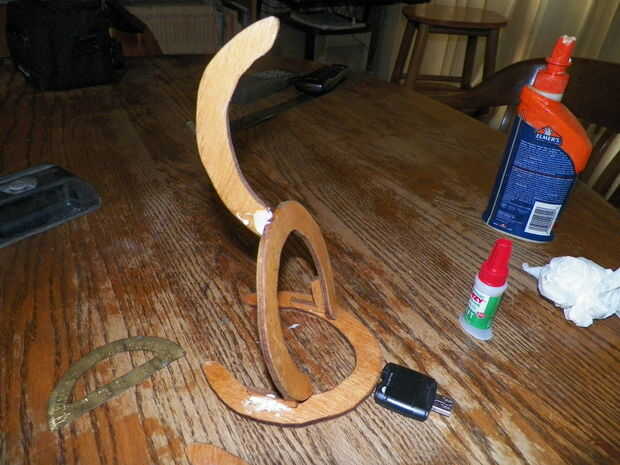 Enchufe en tu pistola de pegamento y dejar calentar. Durante el proceso de montaje, hacer todo lo posible para no hacer un lío con el pegamento caliente. Pegar las llaves a la herradura de la pata (como se muestra en la foto) y luego pegar esa herradura en la herradura de fondo. Corte una herradura a la mitad y esa mitad a la mitad de la pieza de la pierna del pegamento (como se muestra en la imagen principal). En su última Herradura, cortar una entalladura en la parte superior de la curva, por lo que se forma sobre la pieza de la espina dorsal y luego péguelo cerca de dos pulgadas por debajo de la parte superior de la columna vertebral. Finalmente, corte una pieza oval de madera (la pieza del sombrero) y luego perfore un agujero en el centro. Inserte la hoja del anime a través del agujero en la pieza del sombrero y luego vuelva a colocar la hoja para el anime. Corte una ranura rectangular en la pieza del sombrero (la pieza oval) sólo lo suficientemente grande como para que el sombrero puede deslizar sobre la columna vertebral. Pegue el sombrero en lugar de 3/4" debajo de la parte superior de la columna vertebral.