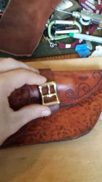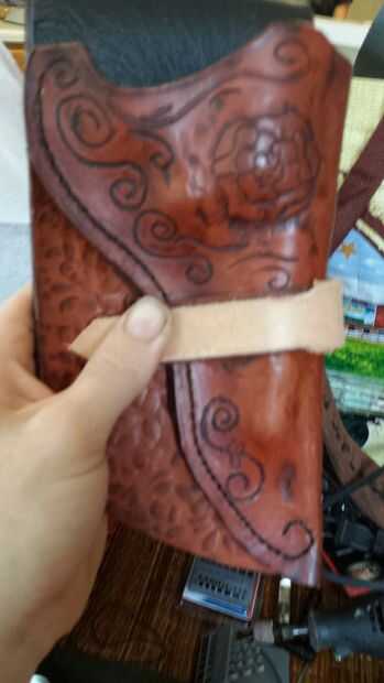 Así que aquí está lo que hice. He creado una ranura en el backpanel y deslizó la correa a través. Yo no había previsto lo suficiente anticipación y fue demasiado corta para llegar a todo en la parte delantera una hebilla de la correa, pero esto es aceptable. He extendido la correa y corregir el ángulo, por lo que sería paralelo con el primer "paso" de la correa. Yo también "volteado" la correa de lado ocultar lo estaba hacia fuera en la parte delantera de la funda, darme más espacio a la herramienta. La hebilla que añadido con un pequeño retal de cuero mojé, formado y cosidas en.