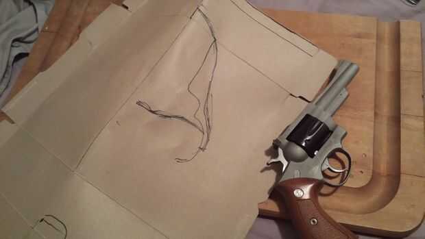 Un buen patrón es esencial para un buen ajuste. ¿Qué mejor manera de asegurar un buen patrón que hacer su propia? Lo hice con cartulina. Dibujé una línea central que puso el centro de mi pistola en vertical y luego la rueda al plano. Esto le da algunas compensaciones para el grueso del revólver. Darme media pulgada con traza un borde de la funda, a lo largo de la parte exterior de la funda.