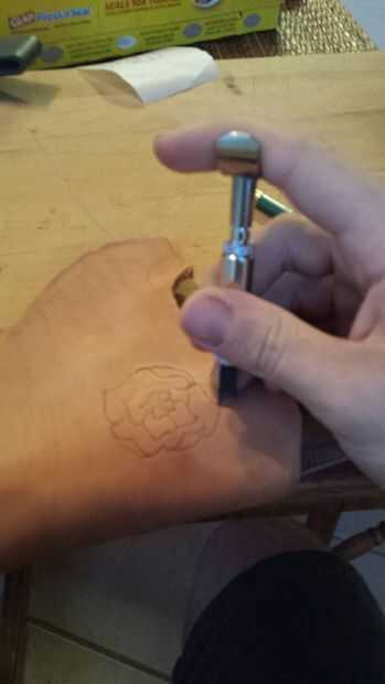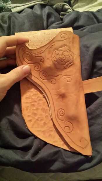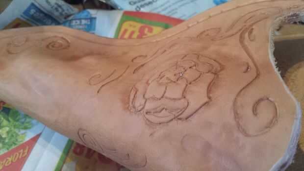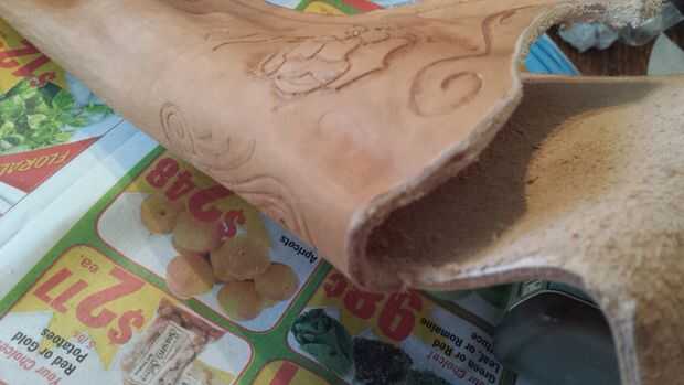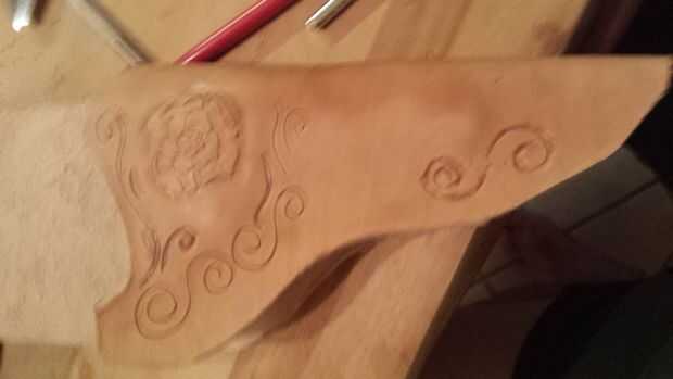 Hay numerosos Instructables buena sobre cómo herramienta de cuero, así que no voy a ahondar en eso. Formé el cuero un poco antes de funda para tener una idea de donde yo quería que mis diseños, había lo había fileteado, luego había terminado de formar. Que forma es bastante simple. A lo largo de los bordes cosidos, recomiendo cortar y biselar una costura de ranura si no tienes un fabricante costura de ranura, que no.