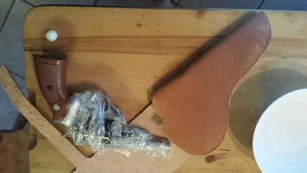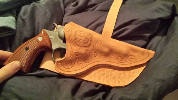 Me moje el cuero y di es un momento para que el agua empapar en. Envuelve mi Ruger en envoltura de plástico, porque en los 38 años, desde ha conseguido mucha paliza y tiró el cuero mojado alrededor de él. Con mis dedos presiona el cuero alrededor de los bordes duros de la pistola hasta que el cuero sólo comenzó a conservar la forma. En este punto lo funda. Dejo el cuero seco de herramientas, luego volver a mojar y comenzó a formar otra vez. Esta vez que usé mi herramienta de sombreado pera ayudar a lisa y forzar el cuero de forma aún más, otra vez centrándose en los bordes ver notas en imágenes de 4 y 5.