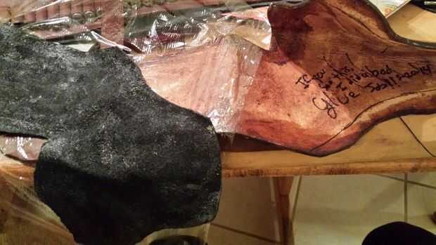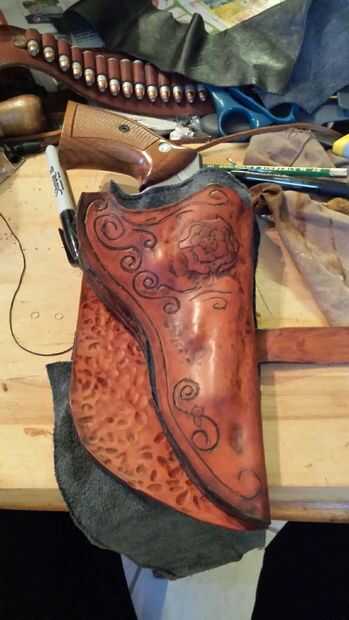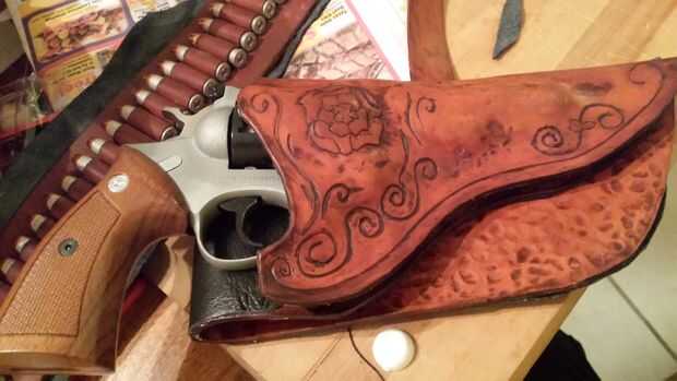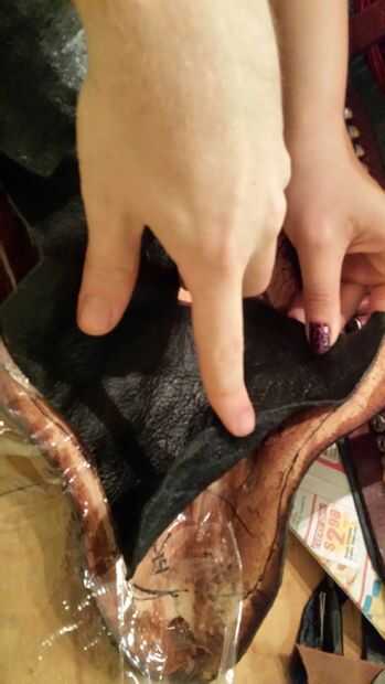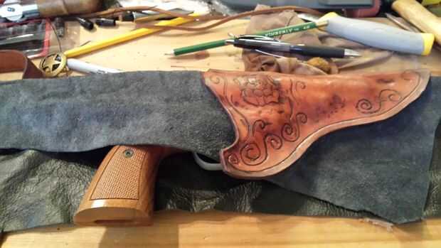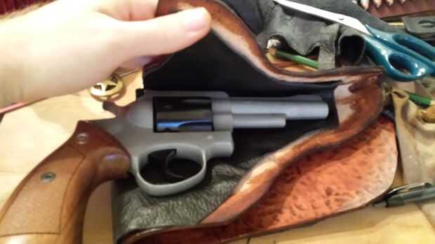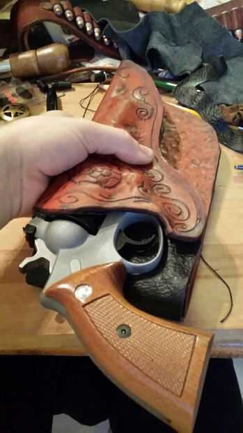Puse plástico en áreas que no quería pegar todavía. Comencé en la boca de la funda de protección, asegurándose de que los bordes emparejados para arriba, estirando y empujando en el revestimiento de allí para cumplir con el exterior que era el revólver antes. El backpanel, había enganchado en el respaldo de una silla luego estira el forro sobre él. Aplicar el revestimiento con la cáscara como cerca de la forma como posible ayuda a mantener la guarnición ordenado, Leathercrafters me odian! Sin estrías ni arrugas aquí con este simple truco!