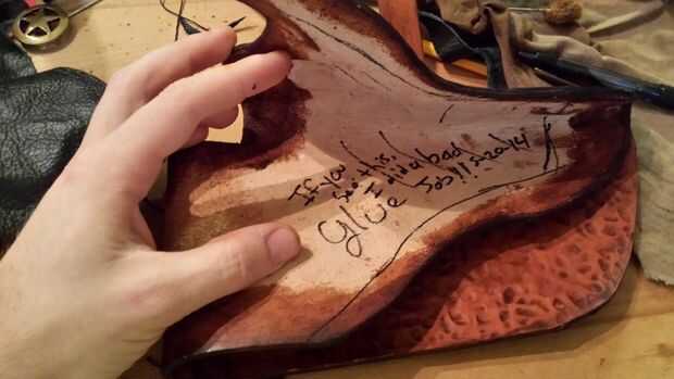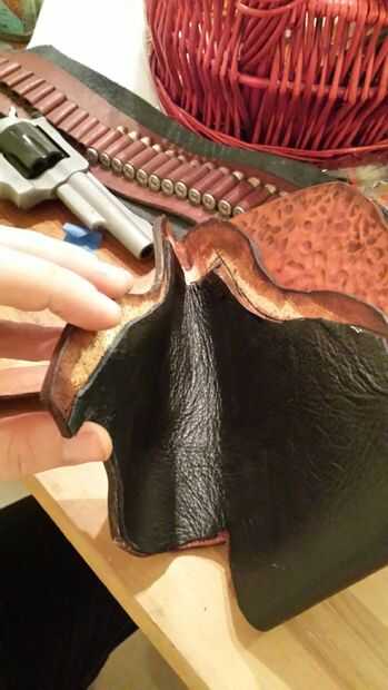 Tomé mi proyecto fuera y liberalmente había aplicado cemento de contacto, yo hice los bordes varias veces. Normalmente pegar y coser el forro, pero odio coser cuero con pasión así que voy a evitar hacerlo si puedo. Yo puedo han olvidado también a herramienta en un surco de costura en la cintura.