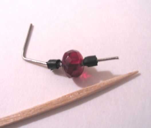 El rodillo superior es un cordón de cristal checo 9 x 6 mm roundelle de artbeads.com. Artbeads.com no tiene ningún pedido mínimo con gastos de envío gratis, pero por favor no tome ventaja de ellos invirtiendo menos de un dólar; comprar algunas perlas. El eje de la rueda se hace de un clip de papel enderezado y formado en forma de L. Pegar el clip de papel a través de los agujeros en la columna y recorte el exceso. Ahora curva el eje hacia adentro ligeramente. Enrolle un poco cinta de Teflón alrededor del eje y deslice el talón sobre él. La cinta de teflón resbaladiza evitará el clip de papel de moler el grano. Ahora dos estrechas tiras de cinta de cinta aislante en ambos lados del talón. Puede utilizar un pelacables para cortar cinta de exceso. Estos topes mantienen el talón resbale a la izquierda o derecha en el eje al que onda el VDG alrededor. Los agujeros en la columna por supuesto son demasiado pequeños para pasar el cordón y topes, por lo que debe insertar la Asamblea al final de la PVC, enganche la parte inferior de la L en un agujero, a continuación, empuje el otro extremo del eje en el otro orificio.