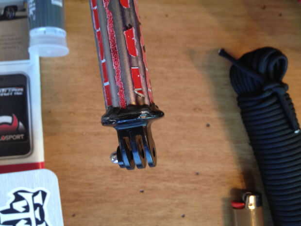 -Una vez la masilla se haya cuajado, raya la cara expuesta de la plaquita y la base del GoPro con la lima, y luego usa el epoxi para unirlas
