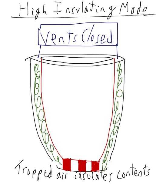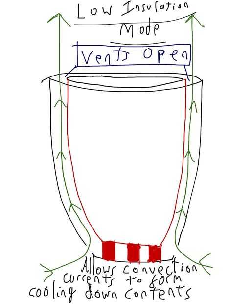 Para resolver el segundo problema de bebidas está demasiado caliente durante demasiado tiempo cuando hace lo primero, utilizan los métodos de transferencia de calor por conducción y convección para extraer calor de la taza tan rápida como sea posible. Simplemente girando el anillo en la parte superior, esto abre orificios en la parte superior de la capa externa de la Copa, permitiendo que el aire circule a través de los orificios de ventilación en la parte inferior y los orificios abiertos en la parte superior hacer circular el aire en la cavidad entre las paredes interiores y exteriores de la Copa. Debido a la bebida caliente calentando el aire en la cavidad entre los dos muros, esto hace que este aire sea menos denso y más ligero que el aire ambiente circundante haciendo una convección actual haciendo que subir hacia arriba y hacia fuera a través de las rejillas de ventilación superior entre las paredes de la Copa debido a su baja densidad y causas aire frío al ser dibujado adentro a través de los orificios de la parte inferior de este aire y este aire frío es entonces calentado para arriba por el bebida y el ciclo comienza otra vez que en última instancia dibuja eficientemente calor de la bebida.