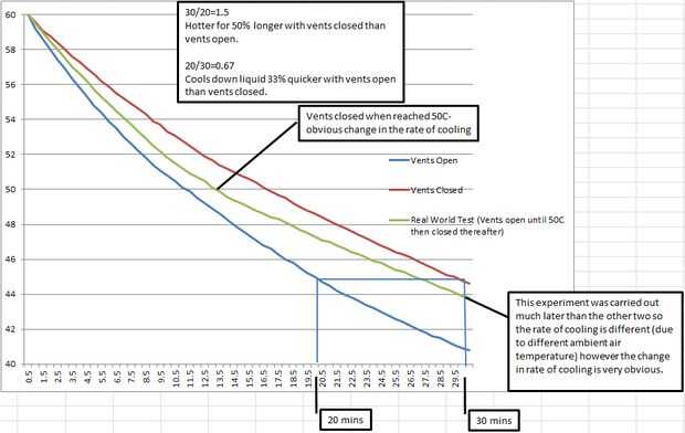 Puse sobre la eficacia de este concepto estableciendo la taza en una tapa de la cocina primero las rejillas de ventilación cerradas y llenarla con agua de 60 C y registrando la temperatura cada 30 segundos durante 30 minutos (60 lecturas en total para cada escenario) la prueba utilizando una aplicación de lapso de tiempo en mi iPad y luego luego pongo estos datos en Microsoft Excel y luego se convierte en un gráfico utilizando el mismo programa que traza gráficamente el calor pérdida que luego podría compararse fácilmente. Me repite esto con los respiraderos abiertos y entonces una vez más con los respiraderos abiertos hasta que la bebida alcanza 50C y luego las ventilación cerrada para el resto del lapso de tiempo que simula el uso normal.
