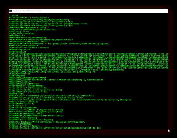 <strong>TMP=C:\Users\SAMUEL~1\AppData\Local\Temp<br>USERDOMAIN=MICROSOFT-SOLUT USERDOMAIN_ROAMINGPROFILE=MICROSOFT-SOLUT USERNAME=SamuelOppong USERPROFILE=C:\Users\SamuelOppong VBOX_MSI_INSTALL_PATH=C:\Program Files\Oracle\VirtualBox\ windir=C:\WINDOWS</strong>