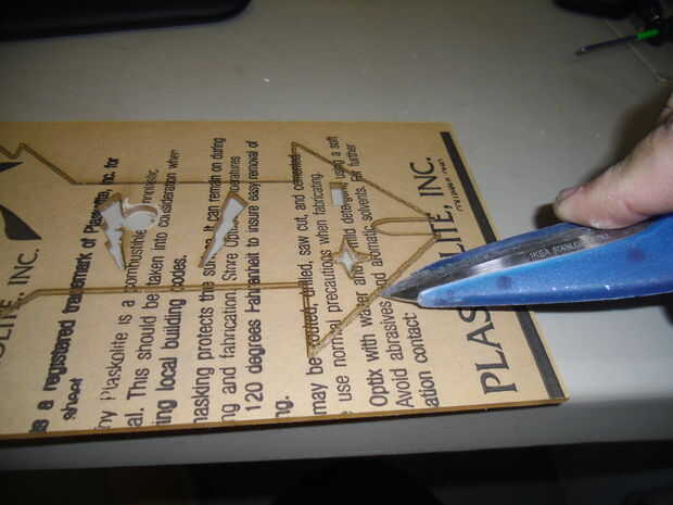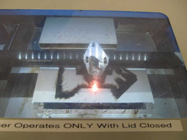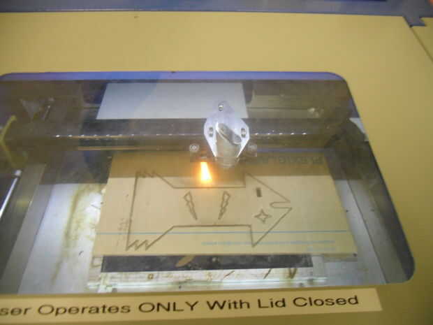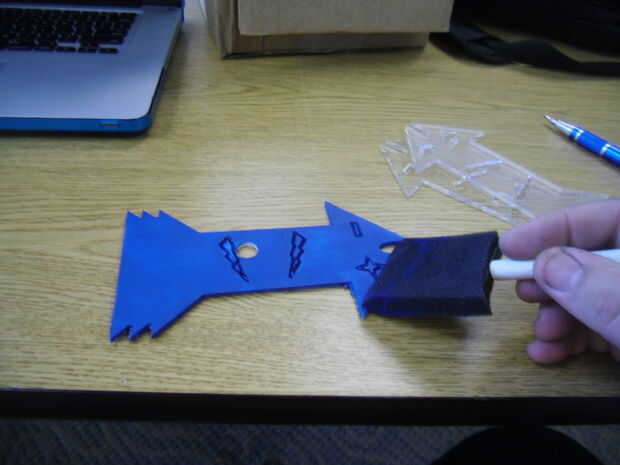 Lasercut primero, la imagen en un pedazo claro de acrílico. Retire con cuidado la pieza y la cinta. Luego intentó usar una pieza reciclada de plástico ABS para la base de la flecha. Esto tomó muchos pases y fue muy chamuscado por el tiempo que se ha hecho. No importa, me lavó la parte y después lo pintó con pintura acrílica azul.