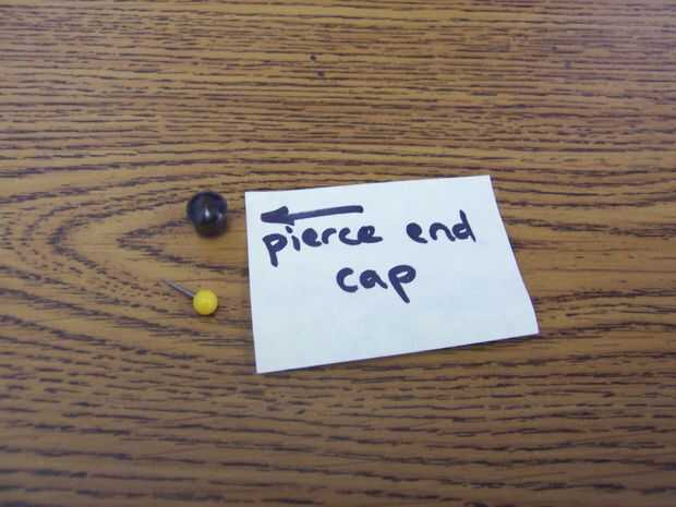 Hay que hacer un agujero de ventilación para que fluya la tinta. Mina había perforado en la tapa del extremo.