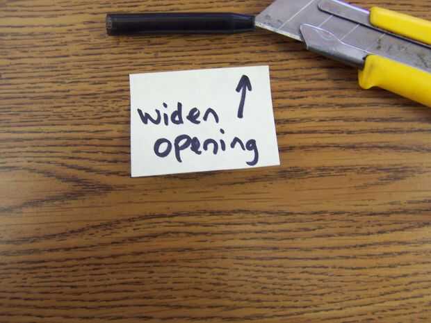 Dependiendo de cómo fue su corte, esto puede ser un paso opcional. Cuando lo hice, el agujero bastante no acepta el inserto de mini pluma. A aburrido el agujero con el cuchillo ligeramente. No tarda mucho.