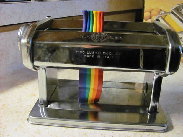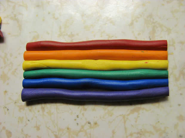 Un collar de arcilla de polímero fácil para mostrar su apoyo a la igualdad del matrimonio.Paso 1: fuentes deTodo lo que necesitas es arcilla, un cuchillo u otro filo y una máquina de pasta o rodillo.Paso 2: Rodillo y cortar Rollo de cada color en un