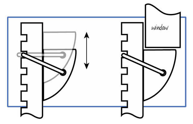 Al principio probé un diseño escalonado (como opciones #2 y #3 en el último paso), cortar una maqueta de tablero de núcleo de espuma. Y parece funcionar bien para los dos primeros "pasos," que sostiene la ventana abierta cerca de cinco pulgadas. Pero a pasos más precaria: el ángulo de la hélice aumenta incómodo en lo más alto. Supongo que mi geometría estaba apagado y que debo tener sólo mantuvo afinando el diseño, pero en cambio abandoné tried-and-true y veered apagado en tierra doodle sobre-diseñado.