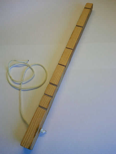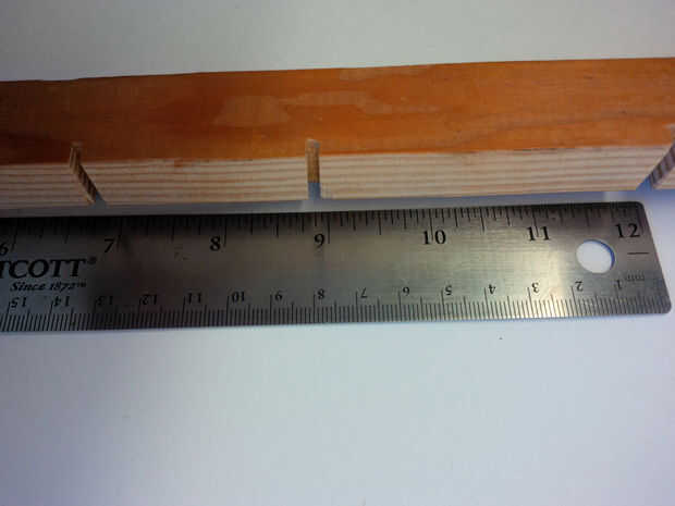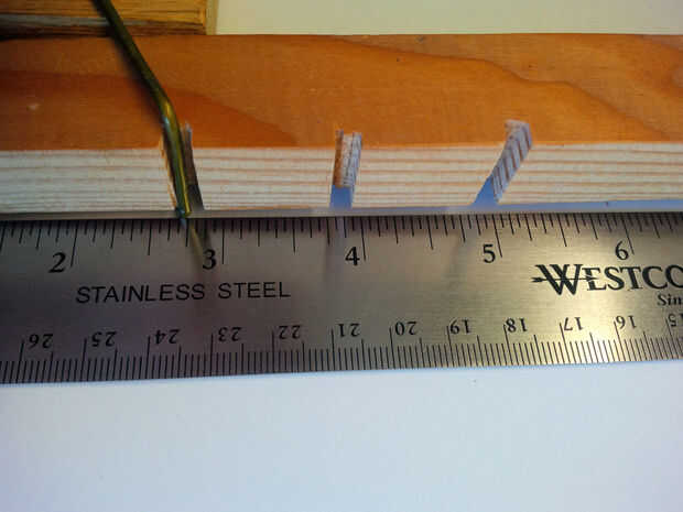 La palanca de la muesca. Junté las muescas más hacia abajo, luego más lejos aparte hacia la parte superior. Coloque la ranura más baja sólo unas pulgadas de la parte inferior, porque no se puede ir cualquier más bajo que la altura de la cuadra. Las muescas deben ser lo suficientemente profundo para mantener el alambre en su lugar y lo suficientemente amplia como para permitir que el cable para deslizarse y salir fácilmente; 1/8" fue suficiente para mí.
