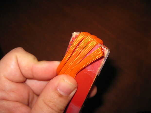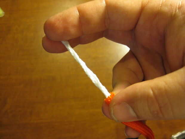 Poner en su cable lock o cuerda del grano. Deslice que hacia abajo ahora que tienes el cable que necesita para el nudo acabado. Había atado un nudo del acollador del cuchillo, así que necesitaba alrededor de 1'. Si usted quiere ser frugal sobre el cable, puede este nudo y pasar el exceso hacia el lado de koozie.