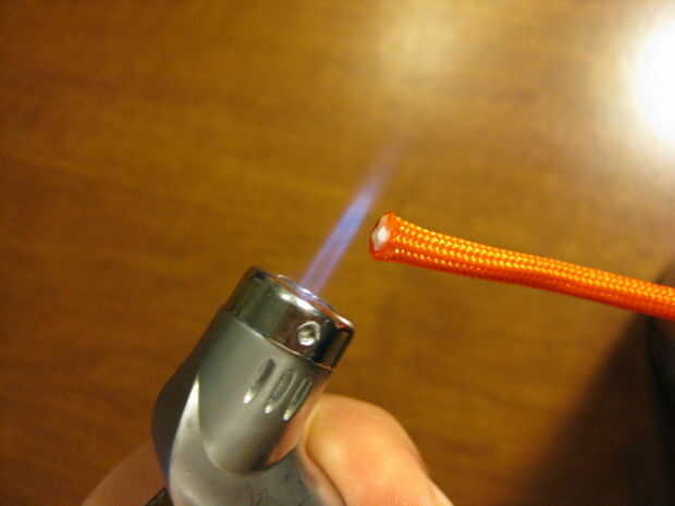 Encender su antorcha/vela/quemador y mueva lentamente el extremo cerca del lado de la llama. A medida que se estrecha bastante verás al final empezar a fundirse. Sosténgala allí y deje que el nylon a derretir lentamente. Si usted ve oscurecer, está consiguiendo demasiado caliente, así que de nuevo fuera un poco. Una vez que se derrite a su satisfacción, ya sea dejarlo aire fresco para formar un buen extremo redondeado o presiona contra una pieza plana de metal como (el lado de su encendedor) o una pieza de plata para formar una apariencia plana.