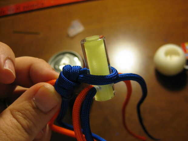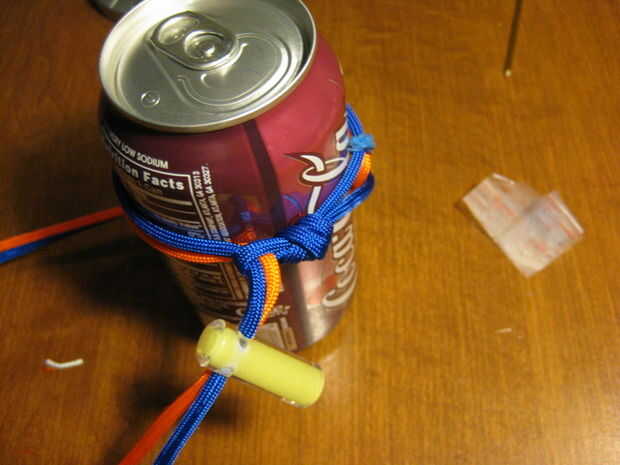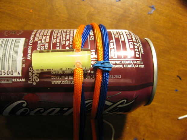 Envuélvala alrededor de la lata con eléctrica A en la parte superior y tire el llavero de cordón firmemente. Si no lo has hecho ya, cortar la goma--hemos terminado con él.