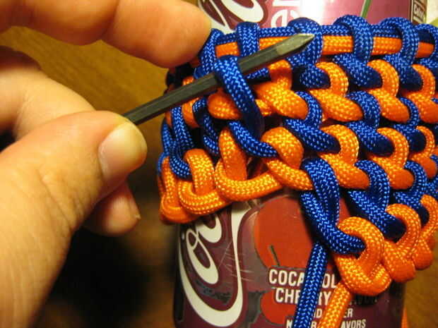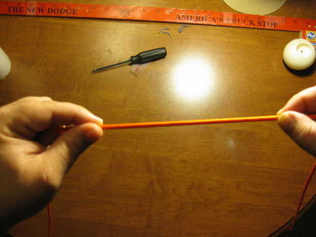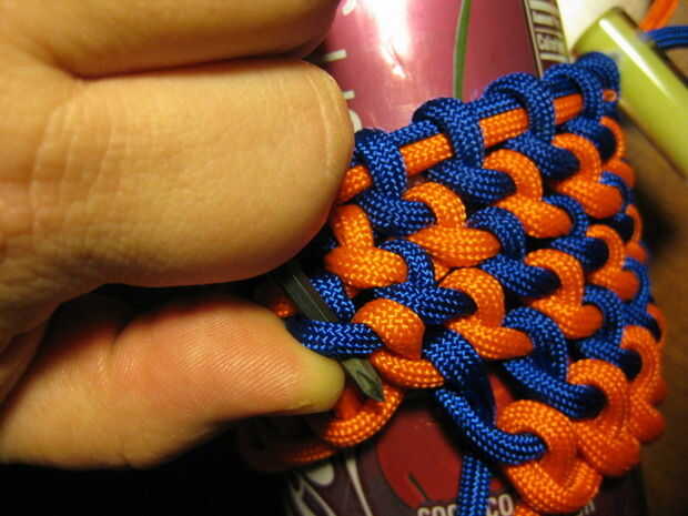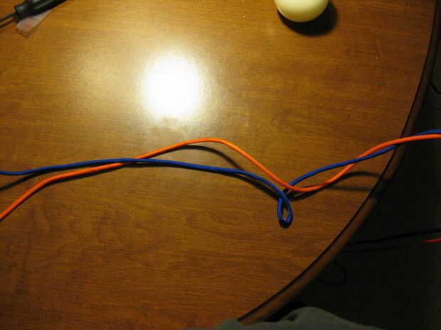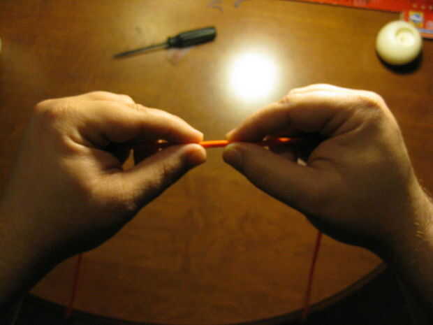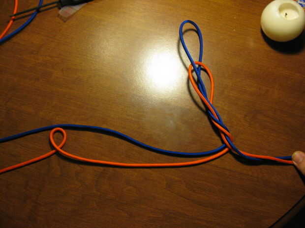 Separar los dos cables y empuje el giro hacia abajo al final del trabajo.  Para mover la torcedura, gancho agarrador de la cuerda entre las manos, agarre firmemente en el extremo del pie y manteniendo libremente en el extremo.  Separe las manos dejando que el deslizamiento de la cuerda a través de una mano.  debe sentir el cable gire lentamente debajo de la mano, tirando el giro hacia el final del trabajo.  Subir la mano agarre y repetir hasta llegar al final.