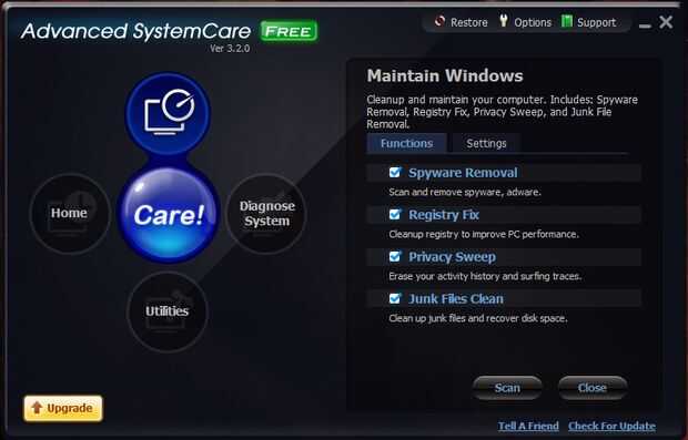 La sección de mantener Windows se centra en cuatro áreas de mantenimiento: eliminación de spyware, registro de limpieza, barrido de privacidad y borrado de archivos basura. El botón diagnosticar sistema proporciona sistema de herramientas de optimización, detecta spyware, desfragmenta el disco y busca la configuración de Windows secuestrada. En nuestras pruebas la exploración y limpieza para cada una de estas áreas llevó menos de 10 minutos para completar. En muchas de estas exploraciones, es difícil decir lo que exactamente se está llevando a cabo por algunas de las herramientas, pero hemos sido capaces de probar contra otras aplicaciones de confianza, que confirmó la eficacia de Advanced SystemCare en esas áreas.